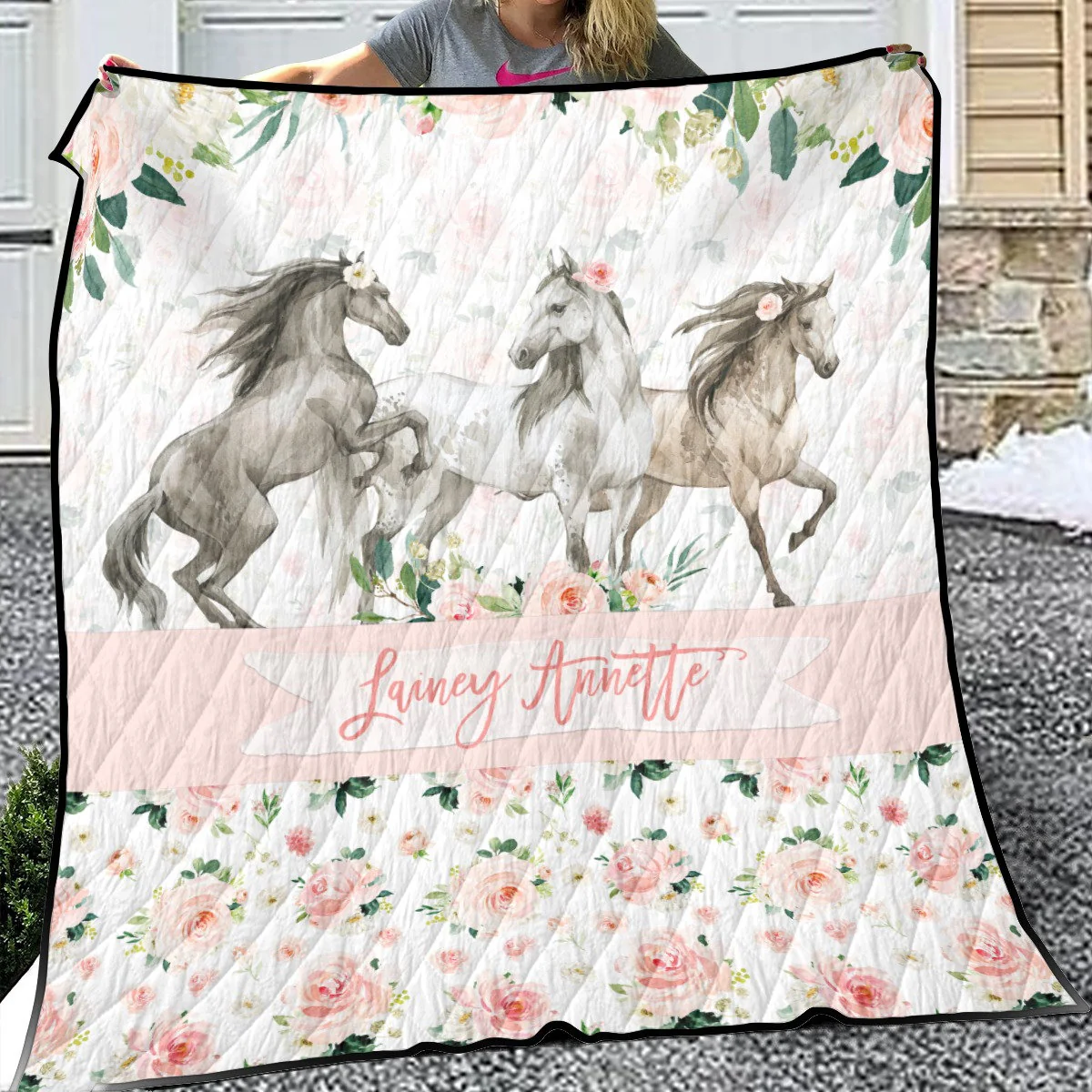 Horses Blush Florals Personalized Quilted Bedspread